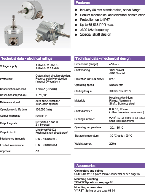 啟動轉矩:≤ 0.025 Nm(IP67)   軸徑:6, 8, 10, 12 mm